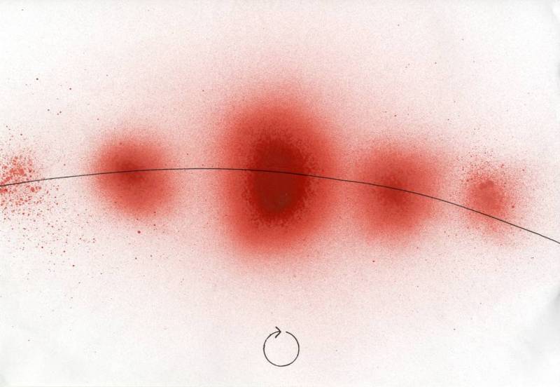 Tad sekoja otrs zīmējums - dzejoļa attēlošana ar krāsu. Šajā zīmējumā redzamo Mārtiņš skaidroja kā nevienmērīga cikla attēlojumu, kas uz kopējā fona ir maznozīmīgs, tāpēc nav pamanāms.