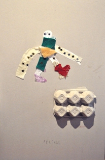 Nezinu, cik liels šeit ir Raušenberga nopelns, kura mākslas darbu reprodukcijas demonstrēju audzēkņiem, bet iecienīta ir krellīšu un podziņu līmēšana, patīk pūkainie materiāli, bet topa augšgalā kā neapšaubāms līderis ir kādas māmiņas gādīgi iepirktā spīdīgā folija. Un tā nu mūsu bomzīši pārsvarā līdzinās 80-to gadu disko zvaigznēm – tie zaigo un laistās folijas greznībā, ko papildina podziņu, krellīšu un pat gliemežvāku akcenti. Te iezīmējas kāda likumsakarība, jo tā pati māmiņa, kas sagādāja spīdīgos materiālus bomžu tēmai, vēlāk uzgleznoja bomža tēlu ar zelta krāsu.